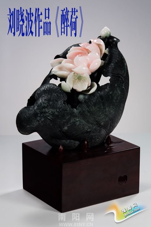 这3件作品均为镇平玉神工艺品有限公司选送:中国青年玉石雕刻艺术家张克钊大师的作品《拽》以其黑白分明的俏色利用和古朴淳厚的乡土气息备受注目;新锐设计师侯庆军的作品《深山访友》意境深远,尽显山水之趣,曾摘取2014中国玉石雕刻“天工奖”金奖;中国青年玉石雕刻艺术家刘晓波的作品《醉荷》宛若天成,黑色的荷叶和粉红色的荷花风姿绰约,色彩的强烈反差让众多从业者都误认为是粘接而成,着实让讲解员费了许多口舌。
