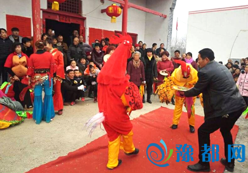 该村村民们自发组织的迎新春秧歌队、舞狮队、腰鼓队正在等轮番上演,精神抖擞的秧歌队身着鲜快明亮的表演服装,随着节奏明快的鼓点挥舞着手中的绸带,扭动身姿将欢笑送给每一位村民;“划旱船”、“化妆舞会”在周边游走,更有栩栩如生的“唐僧、孙悟空、猪八戒、沙僧”惊艳亮相,不停的搔首弄姿,逗得大家欢声笑语不绝于耳;硬气功,顶金枪,艺高人胆大,赢得阵阵掌声;金鸡报晓,喜迎新春更是把现场的气氛推向了高潮。最受大家欢迎的还要数狮子表演,爬高爬低、摇头摆尾,时而气氛紧张、动作惊险刺激,时而和气温顺、耳鬓厮磨,让人心情舒缓。精彩纷呈的节目表演,使现场洋溢着欢声笑语,带来了欢乐和谐的节日气氛。